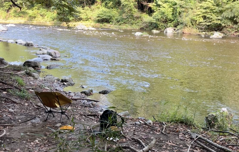 熊が恐いのだけど、一時でも渓谷での一人時間を味わいたいと思い、椅子に座ってボーッと川を眺めました。
