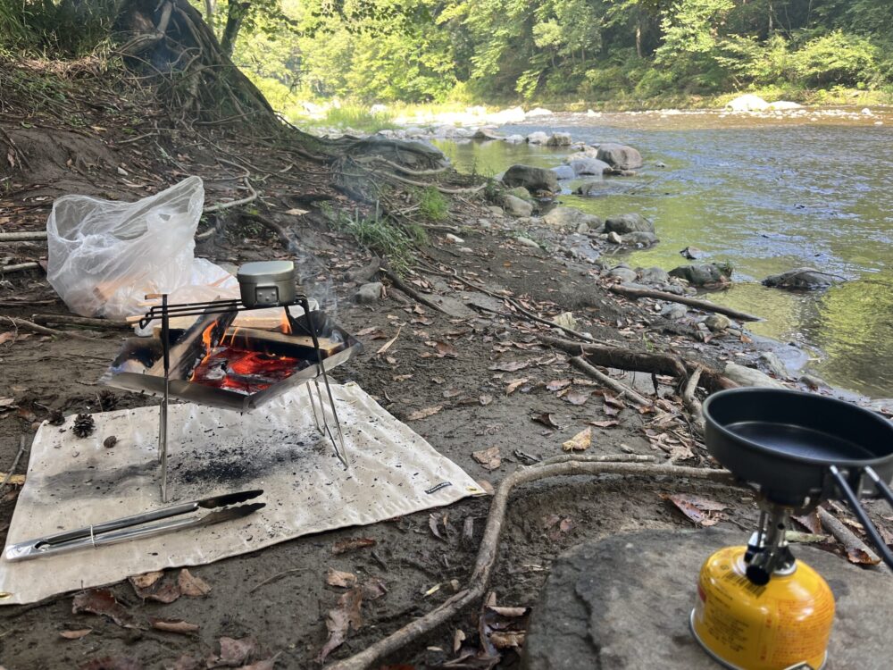 たまに獣の匂いがほのかに漂ってきて、「もしや、川上に熊がいるのでは…」とよぎりました。気が気ではありませんでしたが、ご飯が美味し過ぎて味覚に引き戻されドーパミンが出て、獣臭が香ってくると嗅覚に引き戻されアドレナリンが出るという忙しい状態でした。