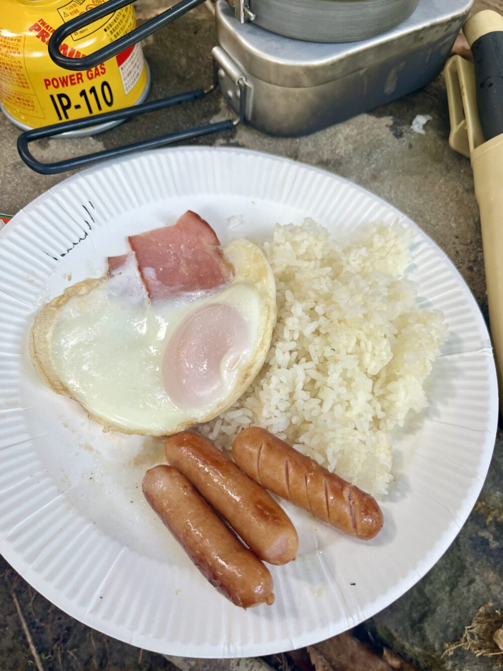 ベーコンエッグにウィンナーを準備して朝ごはんのようなメニューです。