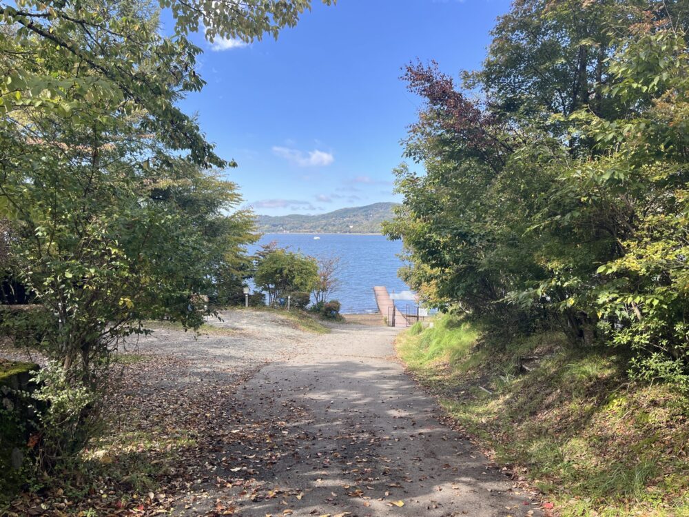 湖畔に続く小道を降ります。山中(私の苗字)が山中湖に着きましたよ。