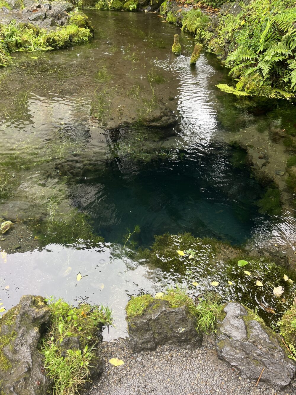 このお釜池も一人でじーっと見ることができて最高です。深くなっているところがあってその深さは4mにもなるそうです。その深いところに一匹だけ大きな白い魚がふわ〜っと泳いでいる姿は幻想的でした。小さな黒い魚は浅いところを泳いでいて可愛いです。