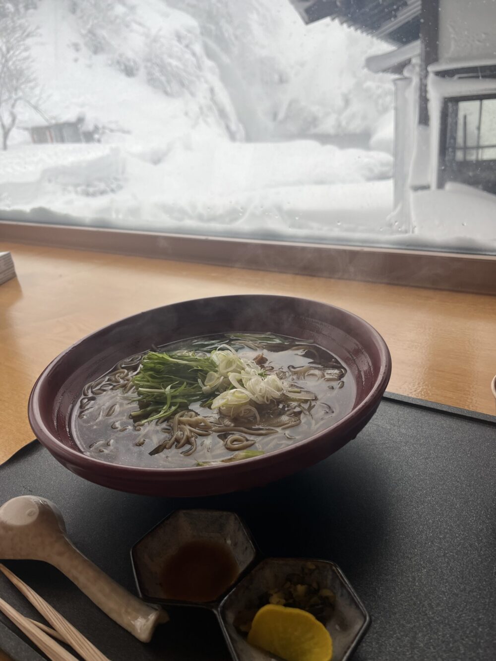 帰り際に食事処を聞くと、同じ系列で5分下ったところにお蕎麦屋さんがあるとのこと。早速向かいます。5分とはいえ、凍った坂道を歩くのでそれはそれで違った緊張感がありました。