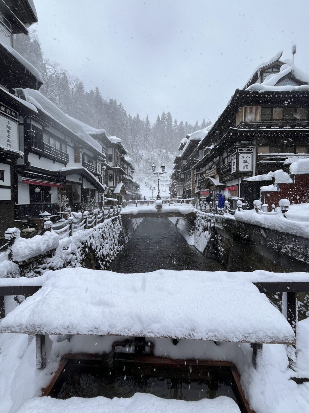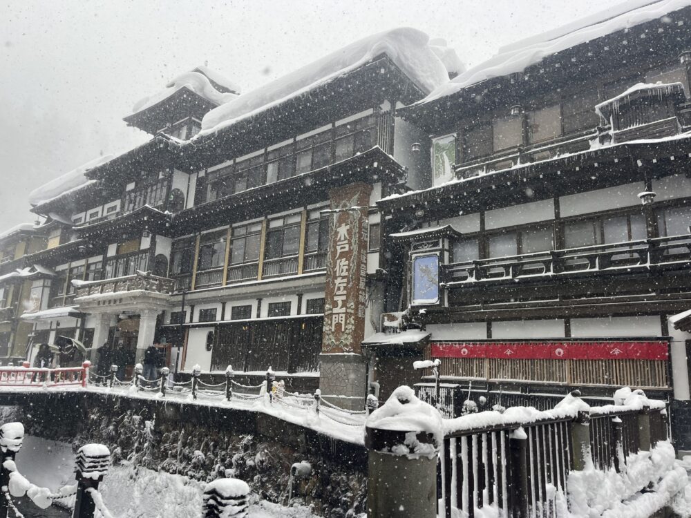 銀山温泉は温泉と付くくらいなので温泉街なのですが、宿に泊まらないと温泉に入れないところがほとんどで、日帰り温泉を利用できる所は2件ほどなんです。足湯もあるけれど、写真のように座る場所には雪が降り積っていて足湯ができる状態ではありません…。