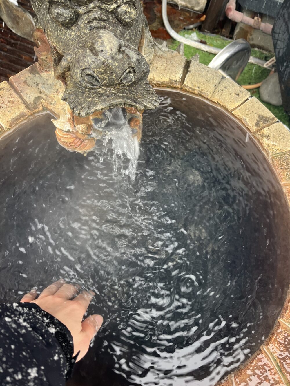 暖かい温泉に手を入れて束の間の暖を取ります。